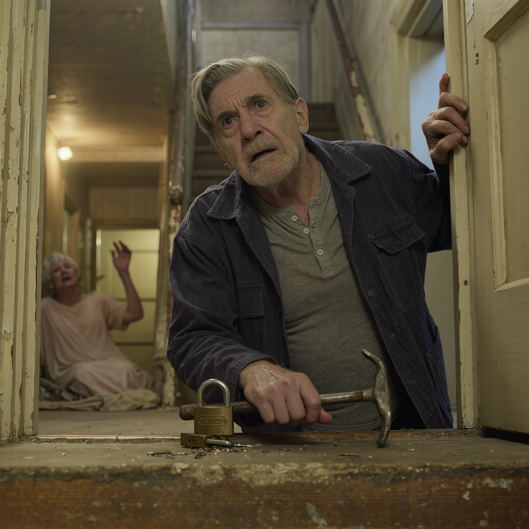 “Margaret?” I called into the darkness. My voice sounded wrong, too big, too hopeful. I set the suitcase down and walked fast, then faster, toward the basement door off the hallway. The knob didn’t give. A heavy‑duty padlock hung there I’d never seen before, stitched through a hasp that had no business on the inside of my home. The thumping quickened, and under it a hoarse, shredded sound that might have been a voice. I sprinted to the garage, grabbed the crowbar off the hooks where I keep my tools—civil engineers never quite stop believing in leverage—and jammed the steel into the shackle. One, two, three violent pulls and the lock broke with a bitter crack that rang in my teeth. The door swung inward, and a sour wave hit me: urine, sweat, the particular cold of concrete that hasn’t seen light in too long.